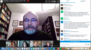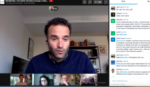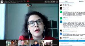Many questions concerned the rising authoritarianism in the EU. Pol reacted to that question by highlighting that while populism seems to be here to stay, the capacity of governments who did not have an expert-based approach has been undermined by the crisis (i.e UK). To this statement, Sara clarified that the British government was always guided by scientific advice and simply wasn’t affected by the crisis as the EU at the time when the ‘herd immunity’ statement was made public. Ivo complemented the discussion by stressing that more autocratic behaviours are to be expected. Politicians might appreciate the technocratic approach for its quickness and might find it hard to give it again away after the crisis. Especially in times of crisis, it is very important to stay critical of the state and its actions. We should prevent the narrative that critisising the government is hampering the resolution of the crisis. Instead, it helps ensuring that the end of the crisis does not give birth to a new problem. To answer a question on how the EU should react towards the newest measures taken by Hungary, Ivo put forward that the EU has limited power in that regard and that it will be able to only check for temporality and proportionality of the measures.