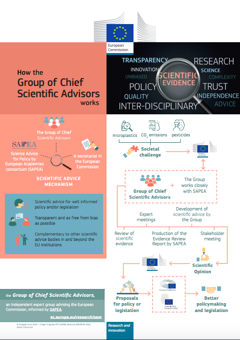 Visit sites: https://ec.europa.eu/research/sam/index.cfm, https://www.sapea.info (for SAPEA) and https://ec.europa.eu/info/research-and-innovation/strategy/support-policy-making/scientific-support-eu-policies/group-chief-scientific-advisors_en (for the EU Group of Chief Scientific Advisory, GCSA). Infographic and Summary: https://ec.europa.eu/info/sites/info/files/research_and_innovation/groups/sam/ec_rtd_how-the-gcsa-works.pdf