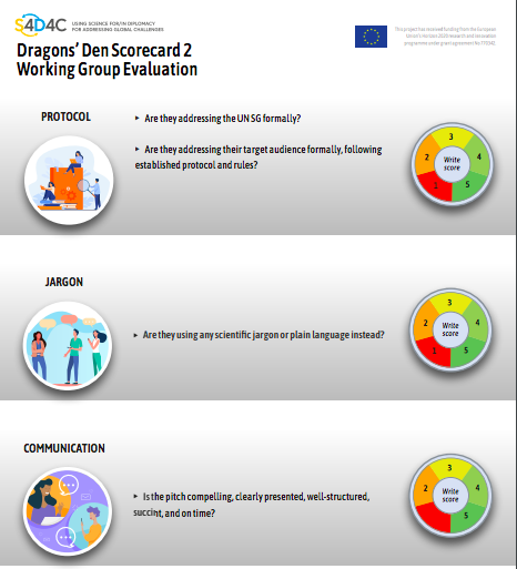 In this part of the event participants were asked to imagine that the Office of the UN Secretary-General has invited S4D4C to convene a High-Level Policython-style event to crowdsource Science Diplomacy Approaches for Addressing Global Challenges. Six teams from around the world had the opportunity to pitch their most innovative ideas for science diplomacy strategies, instruments or mechanisms around two global challenges: the climate crisis and pandemics.