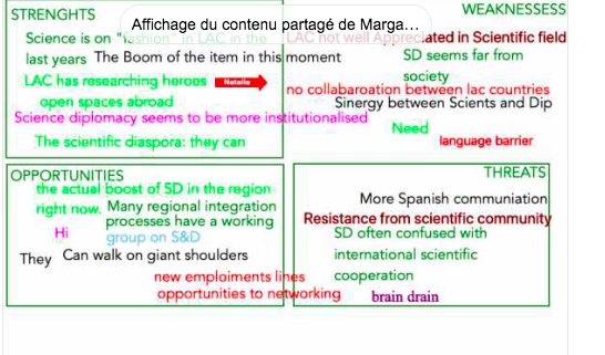 The participants were asked a set of questions that aimed to identify the key characteristics of the science diplomacy approach of the region. Various approaches were used, for example the Latin America group created a SWOT matrix.
