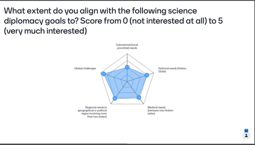 Lorenzo asked the attendees to answers a few questions to get to know each other interests better. To the question “To what extent do you align with the following diplomacy goals?”, the audience values all goals to a relatively high extent, with a bit less interest for subnational level. Subnational levels are indeed less common/known in the science diplomacy world. For an example of subnational SD approach we recommend visiting our knowledge resources page on the subject.