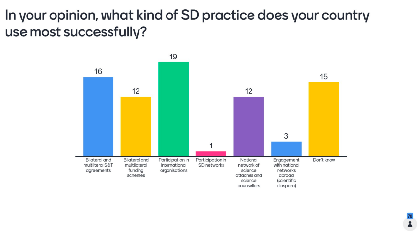 Lorenzo then asked the audience to reflect on the science diplomacy practices of their country of origin. The main national activities that our participants are aware of seem to be related to the participation in international organisations, bilateral and multilateral agreements as well as to national networks of science attachés and science counselors: